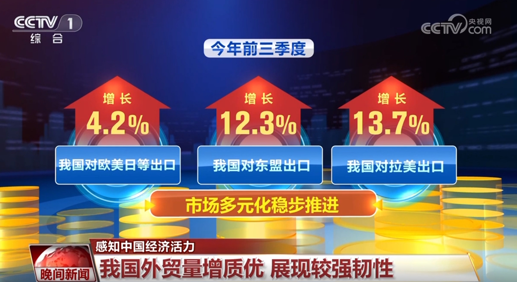 今年以來,我國外貿(mào)量增質(zhì)優(yōu),展現(xiàn)較強韌性。世貿(mào)組織最新數(shù)據(jù)顯示:上半年我國出口國際市場份額為14.3%,同比提高0.4個百分點。前三季度,我國與160多個國家和地區(qū)貿(mào)易實現(xiàn)增長,對歐美日等傳統(tǒng)市場出口增長了4.2%,對東盟、拉美等新興市場出口分別增長了12.3%和13.7%,市場多元化穩(wěn)步推進。在深圳鹽田港,僅今年前9個月就新增了16條航線。