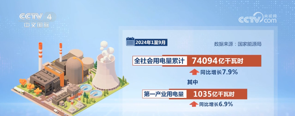 數(shù)據(jù)顯示,今年1至9月,全社會用電量累計(jì)74094億千瓦時,同比增長7.9%。其中,第一產(chǎn)業(yè)用電量1035億千瓦時,同比增長6.9%;第二產(chǎn)業(yè)用電量47385億千瓦時,同比增長5.9%;第三產(chǎn)業(yè)用電量13953億千瓦時,同比增長11.2%;城鄉(xiāng)居民生活用電量11721億千瓦時,同比增長12.6%。