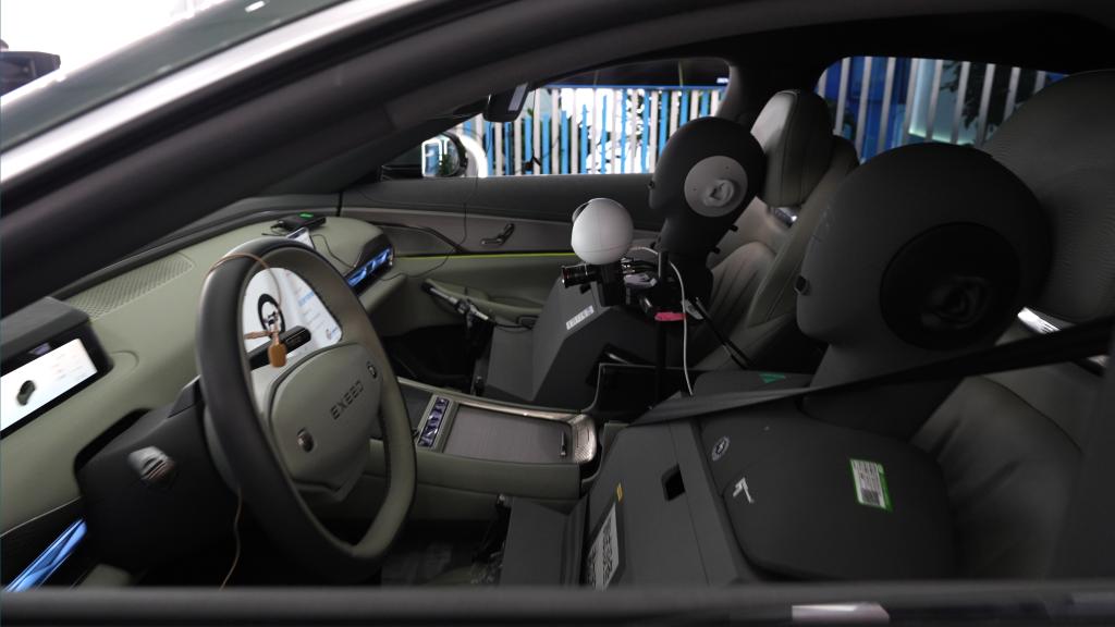 在展區(qū)中的一輛新能源汽車內(nèi)部,一臺機(jī)器人正在模擬乘客與汽車進(jìn)行語音交互,汽車外的一塊大屏幕上,實(shí)時分析顯示語音交互效果的準(zhǔn)確性、穩(wěn)定性和及時性,并最終自動生成報告。這款智能座艙人機(jī)交互效果評測機(jī)器人首次亮相,便吸睛無數(shù)。