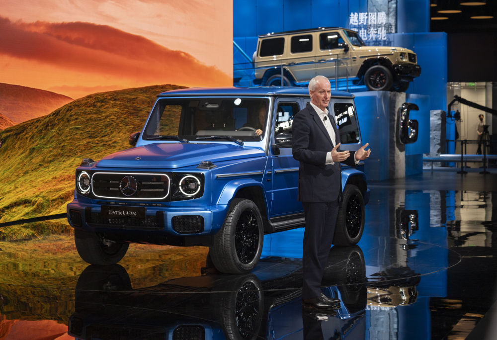 2024年4月25日,在北京中國國際展覽中心順義館舉行的2024北京車展上,梅賽德斯—奔馳集團(tuán)股份公司董事會(huì)成員唐仕凱介紹梅賽德斯—奔馳純電G級越野車。新華社記者才揚(yáng)攝