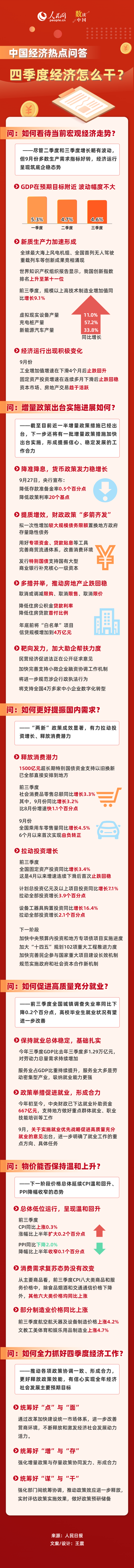 10月18日,前三季度中國經(jīng)濟(jì)數(shù)據(jù)公布:GDP同比增長4.8%,經(jīng)濟(jì)運(yùn)行總體平穩(wěn)、穩(wěn)中有進(jìn)。與此同時,部分指標(biāo)增速有所波動,經(jīng)濟(jì)運(yùn)行出現(xiàn)一些新的情況和問題。如何看待當(dāng)前經(jīng)濟(jì)走勢?四季度經(jīng)濟(jì)怎么干?針對經(jīng)濟(jì)熱點(diǎn)問題,相關(guān)人士作出分析解答。人民網(wǎng)以相關(guān)報道提供的數(shù)據(jù)為基礎(chǔ)推出“數(shù)讀中國”圖解。