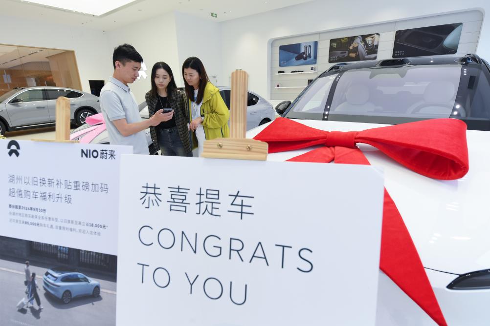 9月24日,在位于湖州市湖東街道的蔚來交付中心,銷售人員向顧客介紹提車后如何申領(lǐng)以舊換新補(bǔ)貼。新華社記者 翁忻旸 攝
