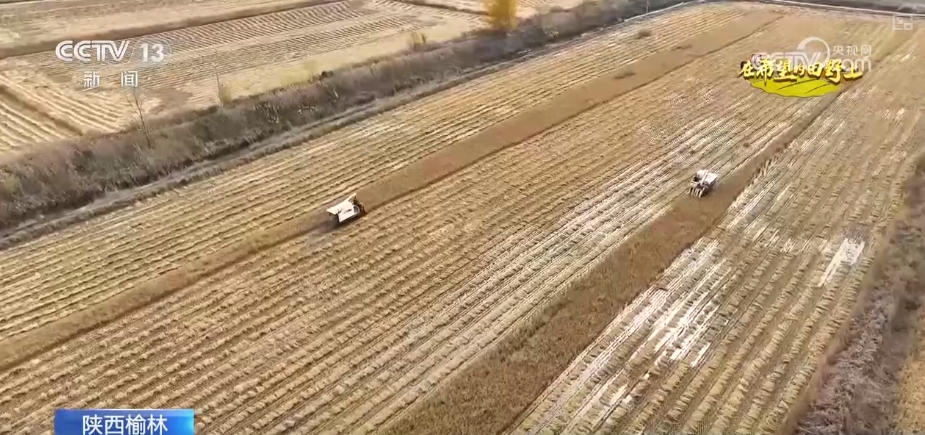 在無定河畔的水稻收割現(xiàn)場,一臺臺收割機(jī)在田間穿梭,將顆粒飽滿的稻谷收入艙中,一派豐收的忙碌景象。