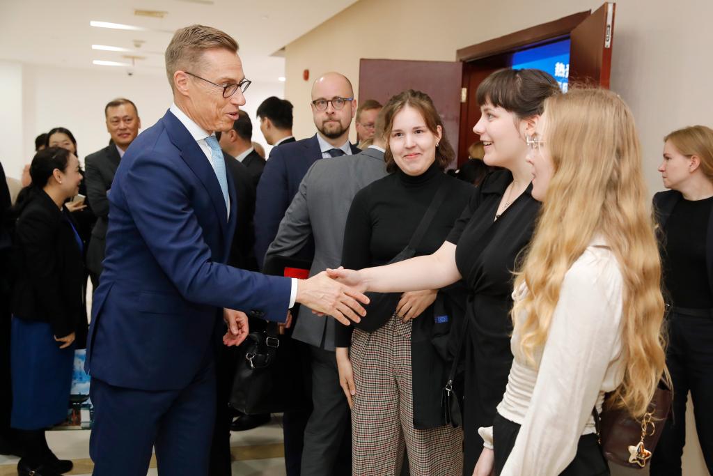 斯圖布與復(fù)旦大學(xué)芬蘭留學(xué)生交流。新華社記者高峰 攝
