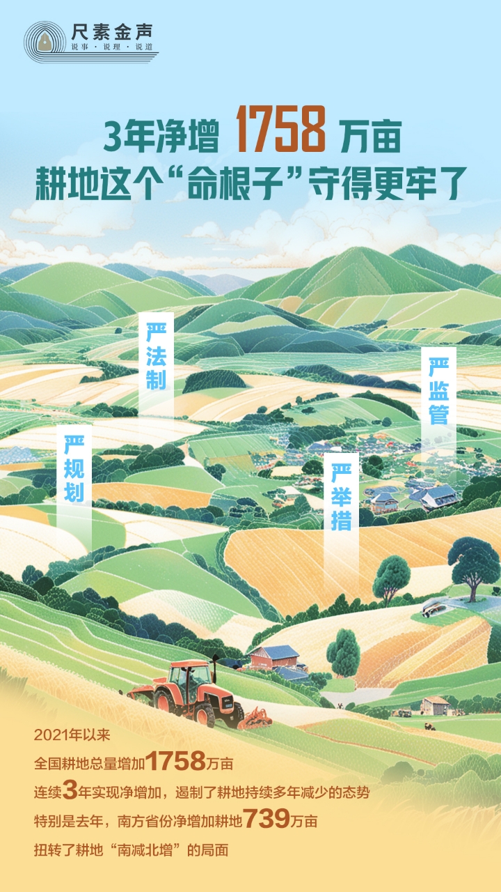 今天的耕地就是明天的飯碗。統(tǒng)籌發(fā)展與安全,堅持穩(wěn)數(shù)量、提質(zhì)量、優(yōu)生態(tài)“三位一體”,進(jìn)一步改革完善耕地占補(bǔ)平衡制度,讓18億畝耕地實至名歸,讓每寸耕地都成為豐收沃土,讓大國糧倉根基更加穩(wěn)固。