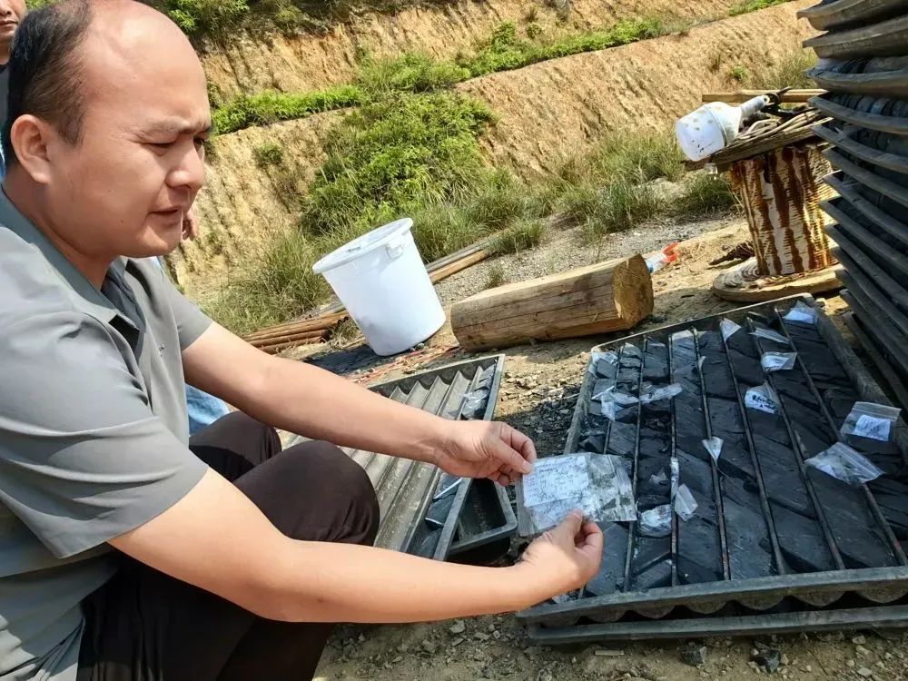 技術(shù)人員展示鉆探新發(fā)現(xiàn)的碳酸錳礦石。新華社記者 蘇曉洲 攝