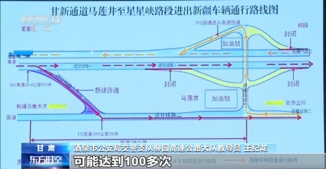 甘肅交投提質(zhì)改造項(xiàng)目河西現(xiàn)場辦主任 李國軍:我們現(xiàn)在采取的方案是,從甘新交界處,星星峽兩公里的位置,修連接匝道。新疆到甘肅的方向,從312線這個地方下高速,一直沿國道走,走到馬蓮井這可以加油,加完油沿著國道繼續(xù)走。然后甘肅往新疆的方向,加完油后,直接上高速走了,所以這兩條線路在這是平行調(diào)度,不用平面交叉了。