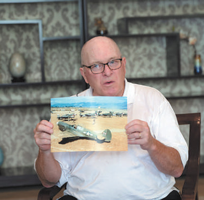小克利福德·隆展示其父親曾駕駛的戰(zhàn)斗機(jī)照片。