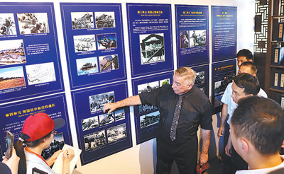 格林(左二)在長(zhǎng)汀舉辦的飛虎隊(duì)主題歷史圖片展上講述歷史照片背后的故事。