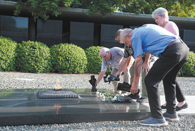飛虎隊(duì)代表團(tuán)成員向南京大屠殺死難者獻(xiàn)上白菊。
