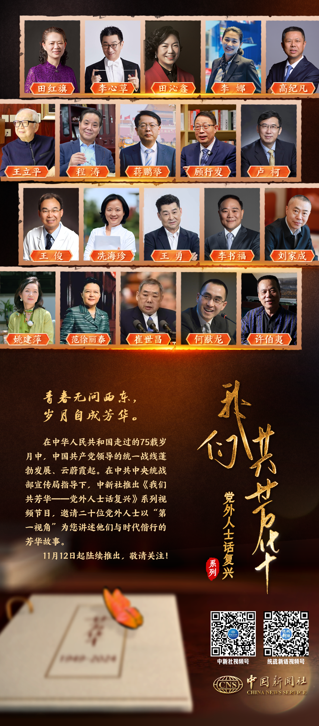 跨山越海,我們赴約依舊,雨雪風霜,待你芳華如初。在中共中央統(tǒng)戰(zhàn)部宣傳局指導下,中新社推出特別策劃《我們共芳華——黨外人士話復(fù)興》,“第一視角”講述新中國走過的七十五載光陰。歷時八個月傾情制作,百余場次拍攝記錄二十位嘉賓的芳華記憶。超強嘉賓陣容,請戳海報↓↓↓