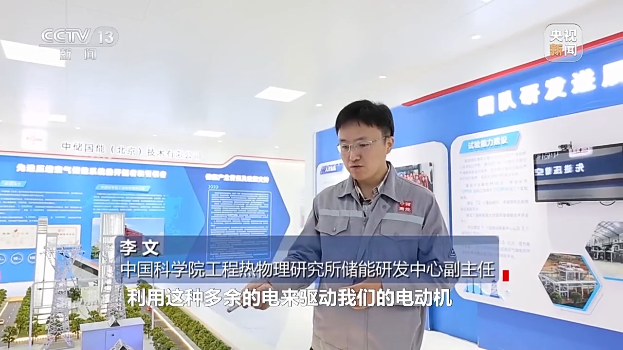 中國(guó)科學(xué)院工程熱物理研究所儲(chǔ)能研發(fā)中心副主任 李文:利用多余的電來(lái)驅(qū)動(dòng)電動(dòng)機(jī),帶動(dòng)壓縮機(jī)把空氣壓縮到高壓狀態(tài),最后存儲(chǔ)到儲(chǔ)氣裝置中,在有需要的時(shí)候,我們利用所存儲(chǔ)的高壓空氣來(lái)驅(qū)動(dòng)膨脹機(jī),帶動(dòng)發(fā)電機(jī)進(jìn)行做功發(fā)電。