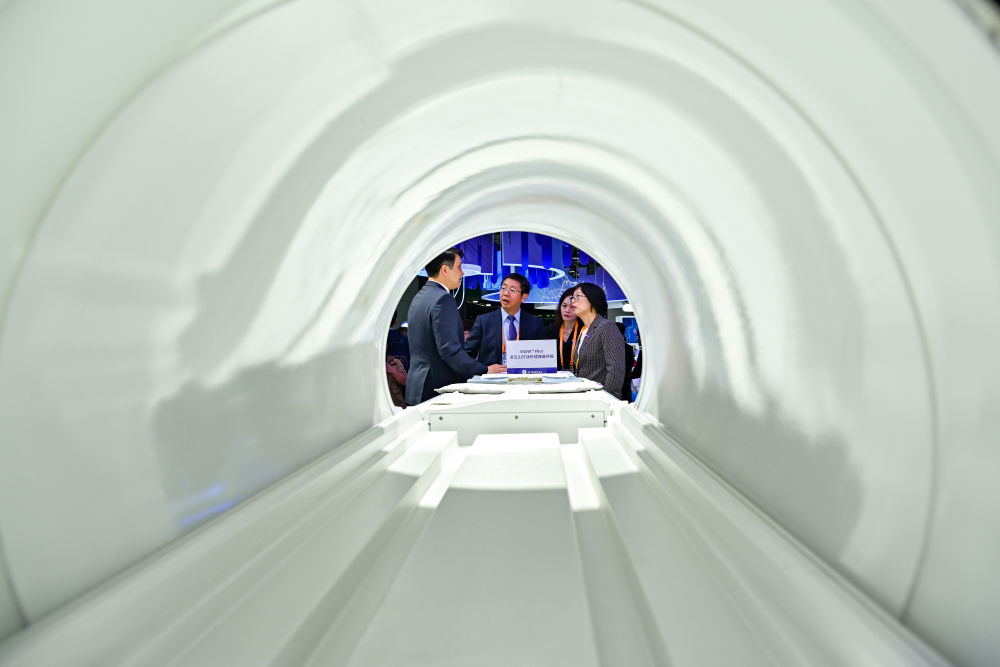 11月5日,人們在第七屆進(jìn)博會(huì)醫(yī)療器械及醫(yī)藥保健展區(qū)GE醫(yī)療展臺了解一款讀秒成像磁共振儀器。新華社記者 張鋮 攝