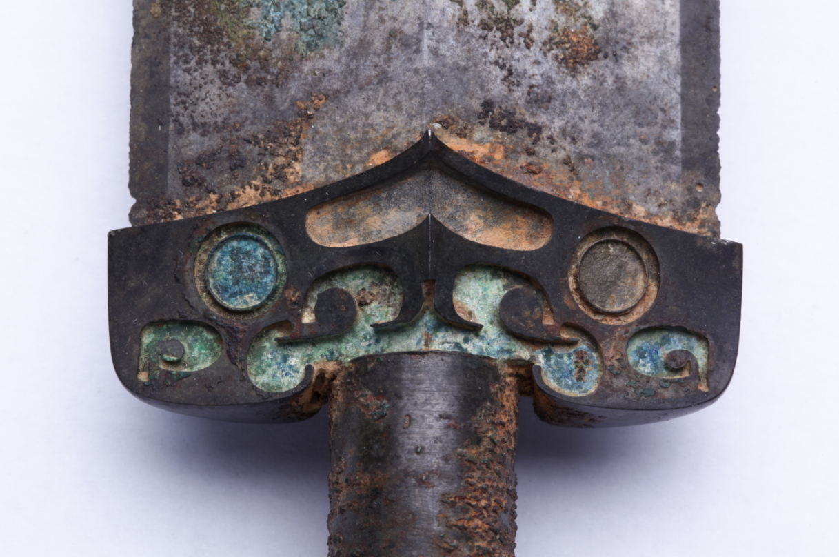 這把青銅劍通長58.3厘米,劍身寬大厚重,在前部有一個明顯變窄,可以提高劍的刺穿能力,劍尖雖然只有極尖銳的一點,但不可思議的是,在高倍放大鏡下仍然可以看出有六至八個截面。劍身雖然光素,仔細觀察會發(fā)現(xiàn)寶劍通體泛著幽幽的神秘藍光,劍格上鑄出獸面紋,鑲嵌的綠松石有一面已經(jīng)脫落,劍身近格處鑄有兩行銘文:“攻敔(吳)王夫差自乍(作)其元用”,表明這把劍的擁有者是吳國歷史上大名鼎鼎的吳王夫差。