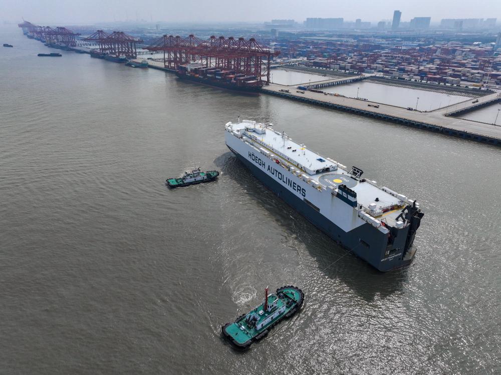 一艘貨輪駛離江蘇省蘇州港太倉(cāng)港區(qū)集裝箱碼頭(無人機(jī)照片,10月10日攝)。新華社記者 李博 攝