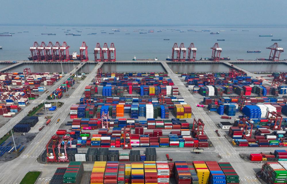 江蘇省蘇州港太倉(cāng)港區(qū)集裝箱碼頭(無人機(jī)照片,10月10日攝)。新華社記者 李博 攝