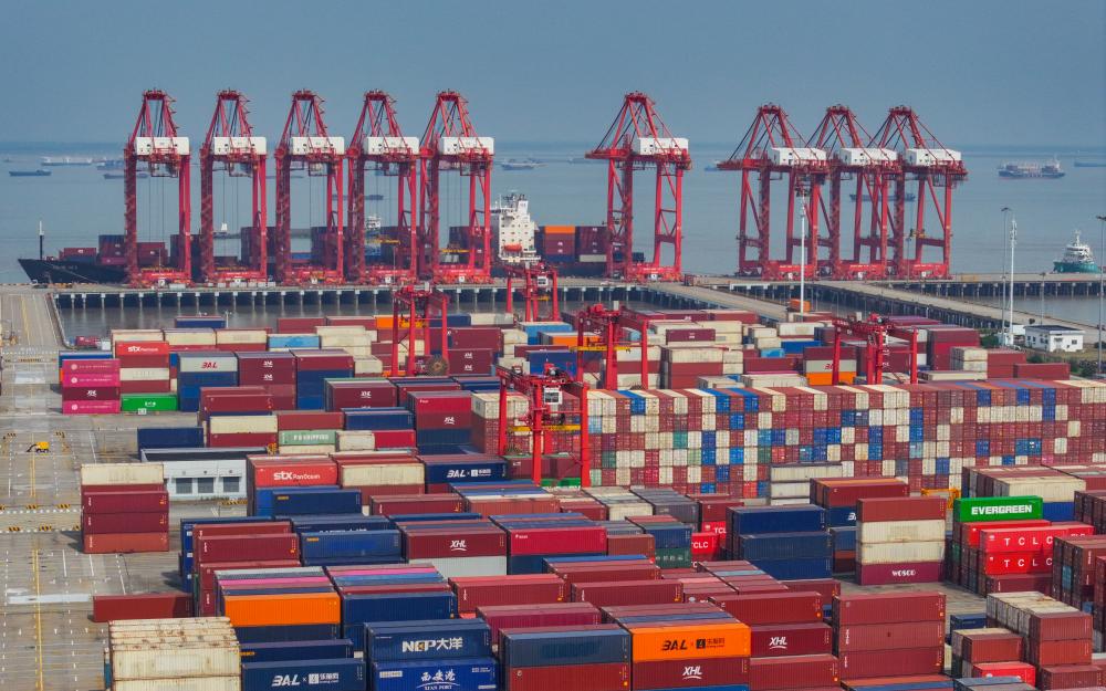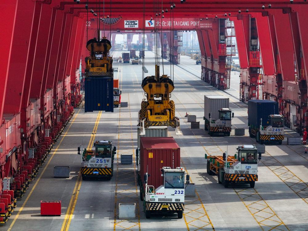 江蘇省蘇州港太倉(cāng)港區(qū)集裝箱碼頭,集裝箱吞吐作業(yè)繁忙(無人機(jī)照片,10月10日攝)。新華社記者 李博 攝