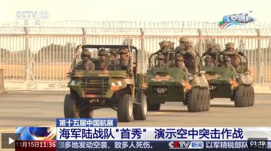 第十五屆中國(guó)航展是海軍陸戰(zhàn)隊(duì)員首次參加,除了演示艦載直升機(jī)飛行課目,還有搭載全地形山貓突擊車及多名陸戰(zhàn)隊(duì)員進(jìn)行快速突擊,奪控?cái)衬繕?biāo)的課目。
