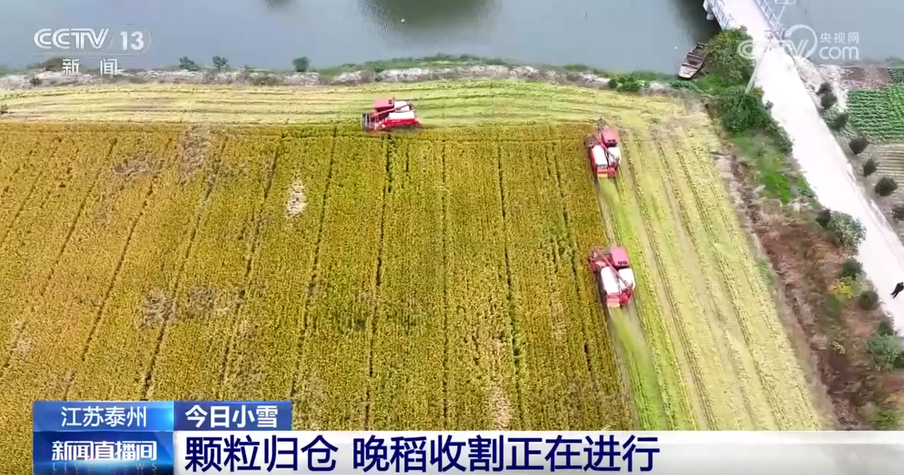 我們現(xiàn)在看到的是江蘇泰州正在進(jìn)行的晚稻收割作業(yè)。這個(gè)時(shí)候,當(dāng)?shù)卦绲竞椭械疽呀?jīng)收獲完成,收割機(jī)正開(kāi)足馬力進(jìn)行晚稻收獲,割穗、脫粒、粉碎秸稈,一氣呵成,連倒伏的稻穗也被采收干凈,金黃飽滿的稻谷順著管道傾瀉而下,顆粒歸倉(cāng)。