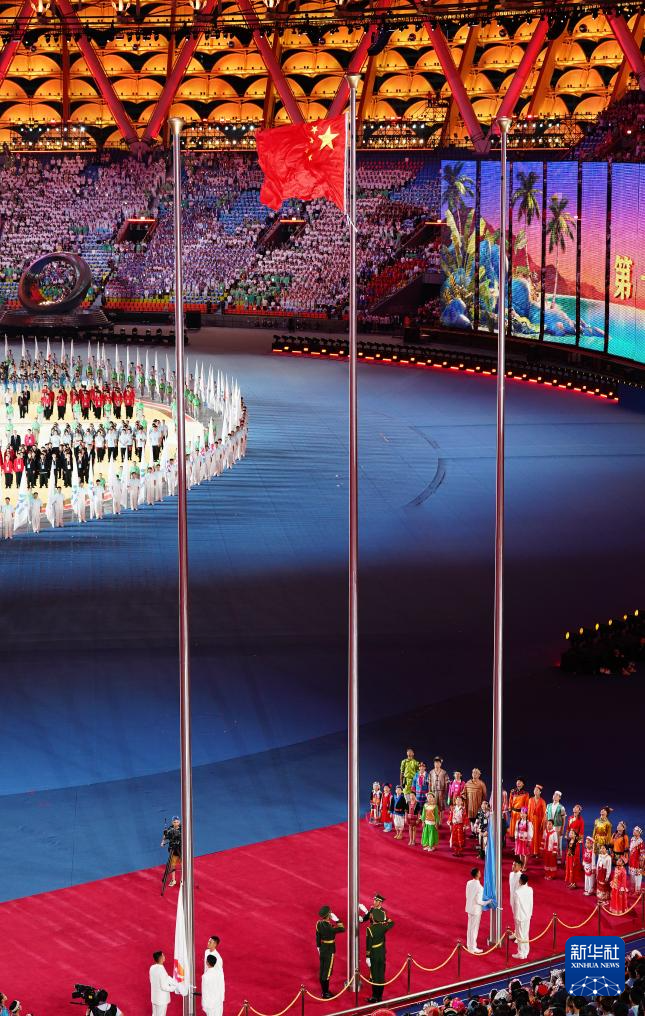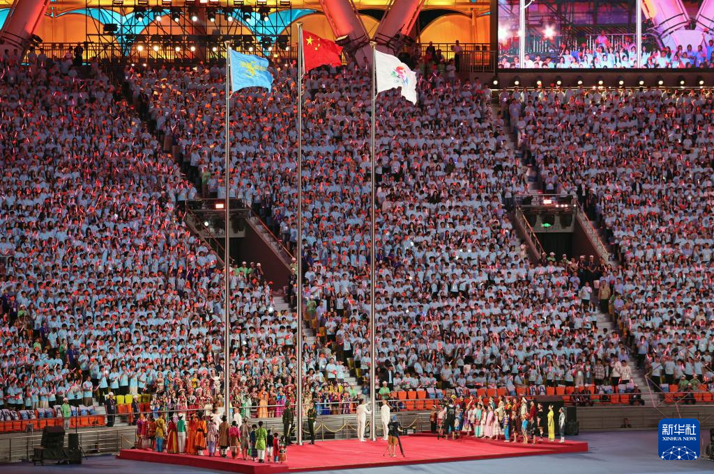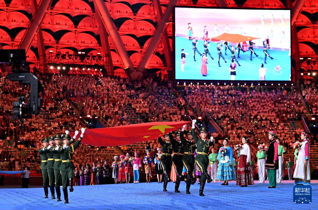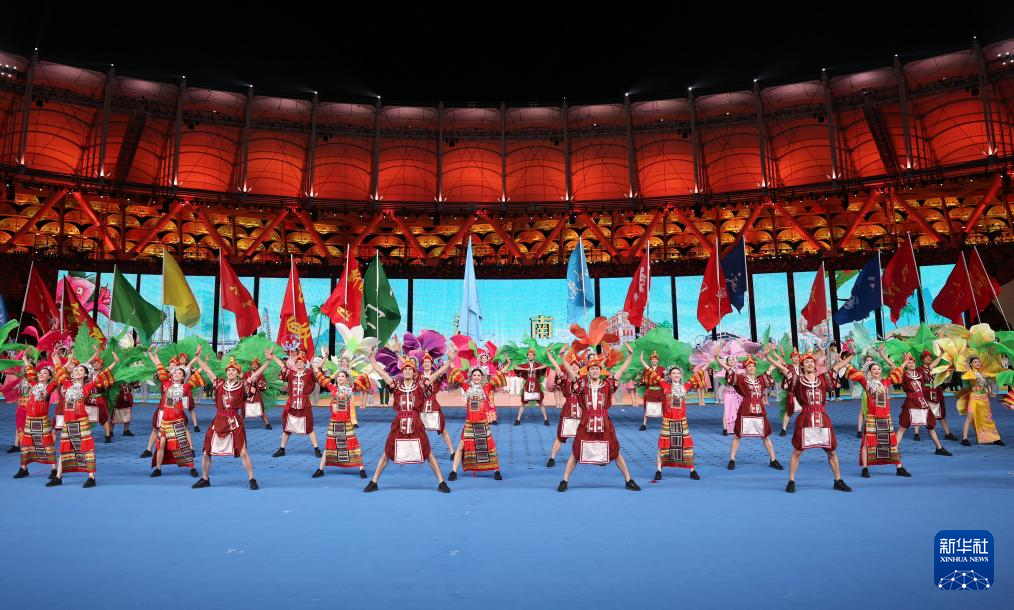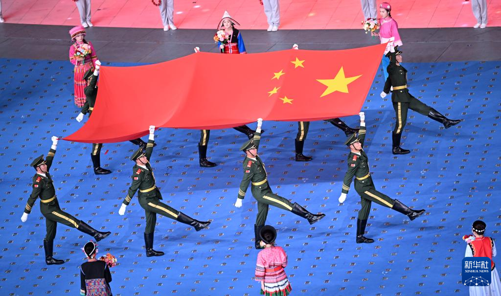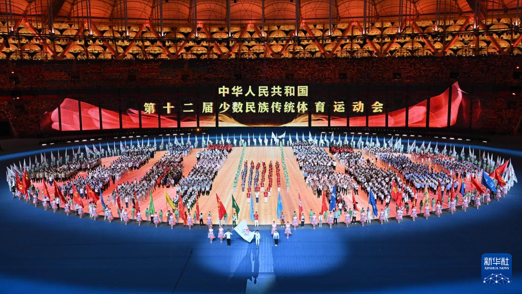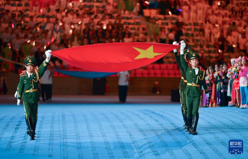 11月22日,開幕式現(xiàn)場升起中華人民共和國國旗、中華人民共和國少數(shù)民族傳統(tǒng)體育運(yùn)動(dòng)會(huì)會(huì)旗和中華人民共和國第十二屆少數(shù)民族傳統(tǒng)體育運(yùn)動(dòng)會(huì)會(huì)旗。