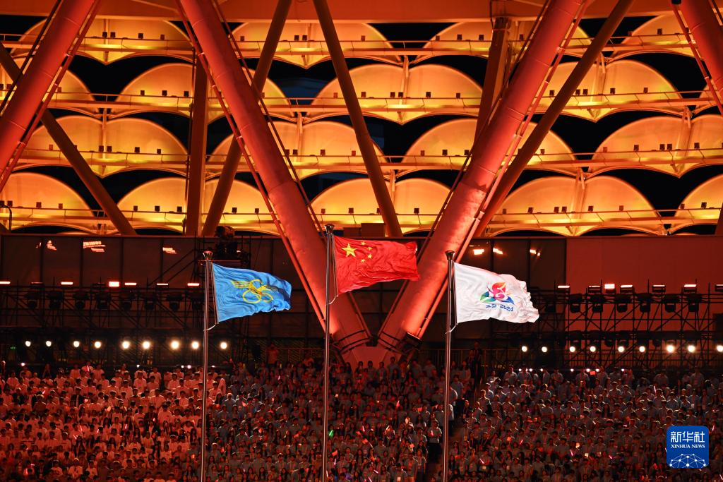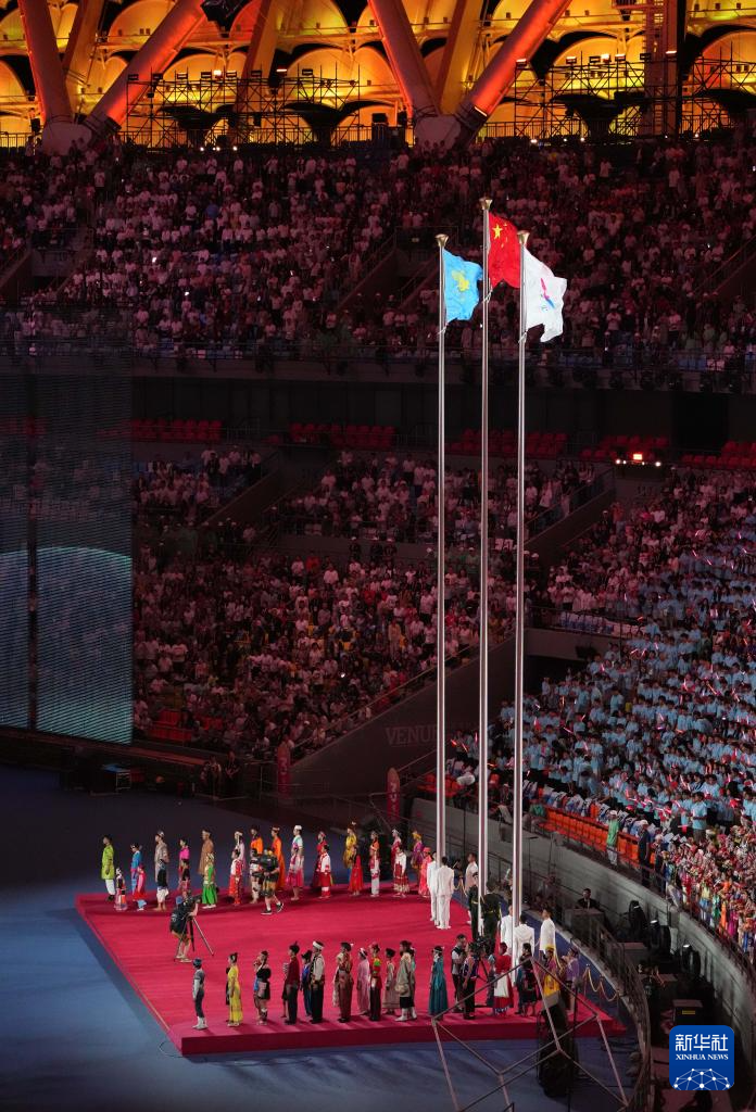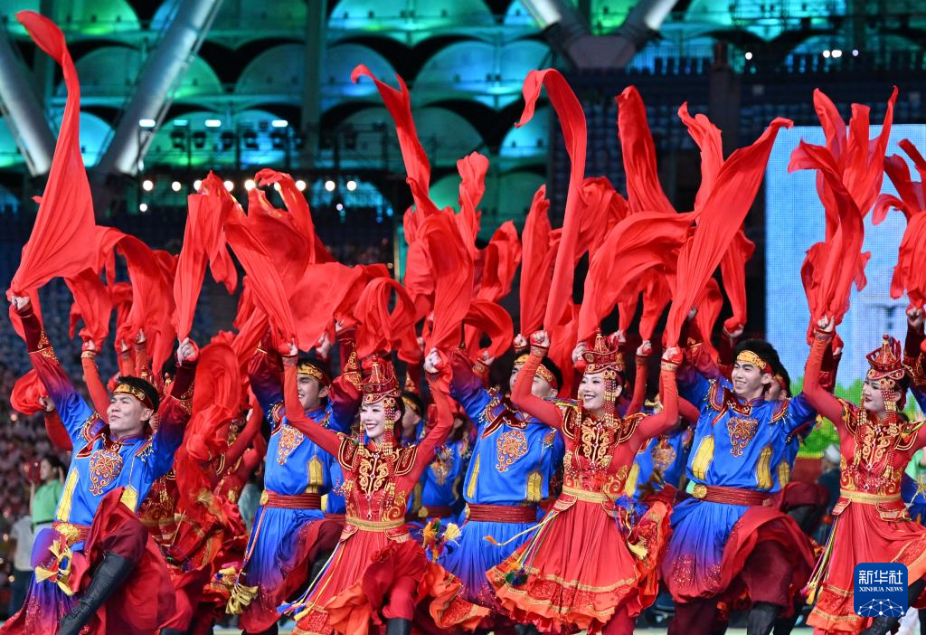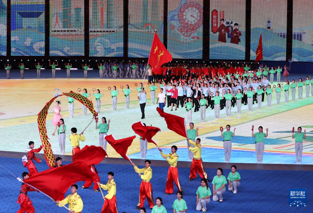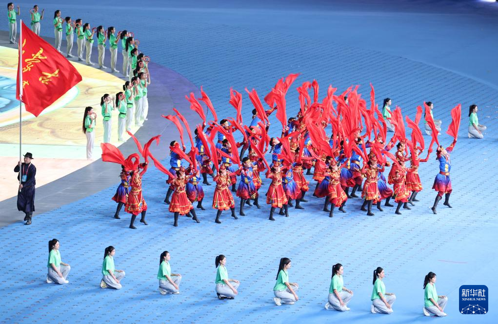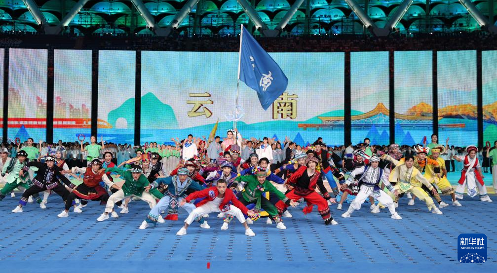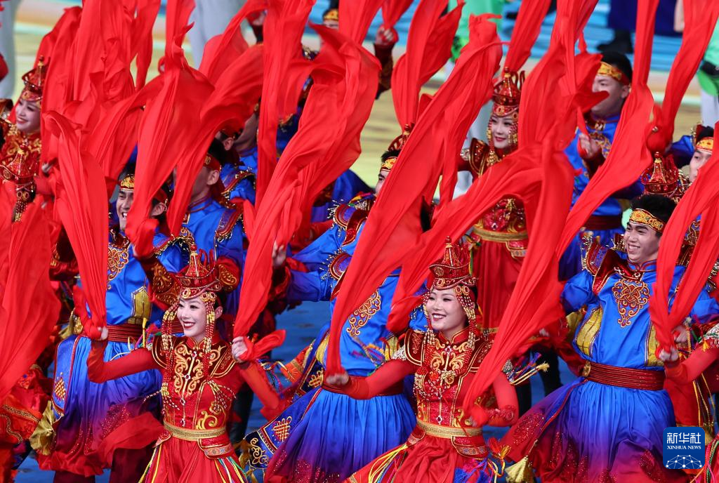 11月22日,開幕式現(xiàn)場升起中華人民共和國國旗、中華人民共和國少數(shù)民族傳統(tǒng)體育運(yùn)動(dòng)會(huì)會(huì)旗和中華人民共和國第十二屆少數(shù)民族傳統(tǒng)體育運(yùn)動(dòng)會(huì)會(huì)旗。