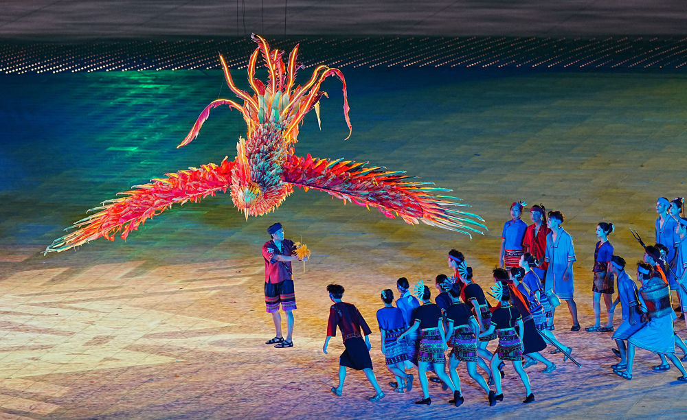 開幕式上,黎族民間傳說中的“甘工鳥”銜來金色稻穗,一幅農(nóng)耕圖景隨之徐徐展開。