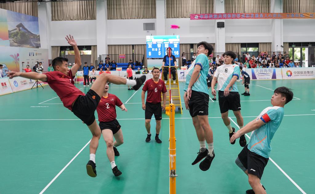 23日,第十二屆全國少數(shù)民族傳統(tǒng)體育運(yùn)動(dòng)會(huì)(以下簡(jiǎn)稱“運(yùn)動(dòng)會(huì)”)毽球項(xiàng)目在海南三亞中瑞酒店管理職業(yè)學(xué)院開賽,斗志昂揚(yáng)的西藏隊(duì)與沉穩(wěn)老練的香港隊(duì)在男子三人小組賽中相遇。頭球、倒鉤球、掃堂腿、腳底扣球絕殺……雙方你追我趕,觀眾看得目不轉(zhuǎn)睛。