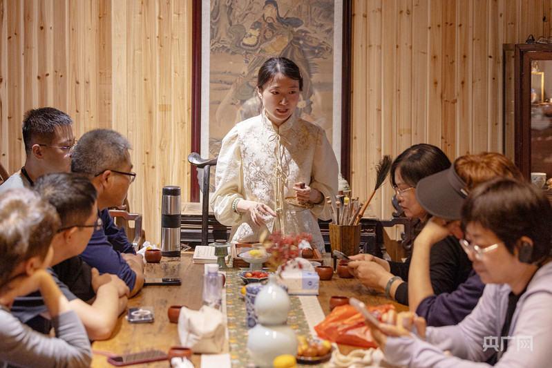 在倒扒獅街,“90后”安慶姑娘秦無顏是一家文化主題會館的主理人。在她的會館里,檀木、玉石等制作而成的新中式文玩飾品、傳統(tǒng)工藝面料制作而成的“新中式”服裝、古色古香的“新中式”茶館,定期舉行的雅集活動……無一不體現(xiàn)著獨特的東方美學。2020年,在上海從事珠寶設計工作的她返回家鄉(xiāng)經(jīng)營起這家文化空間?!凹戎鹦拢矊じ??!彼M?,客人來到這里,放慢腳步,在交流與體驗中感受傳統(tǒng)文化的魅力,豐富精神體驗。
