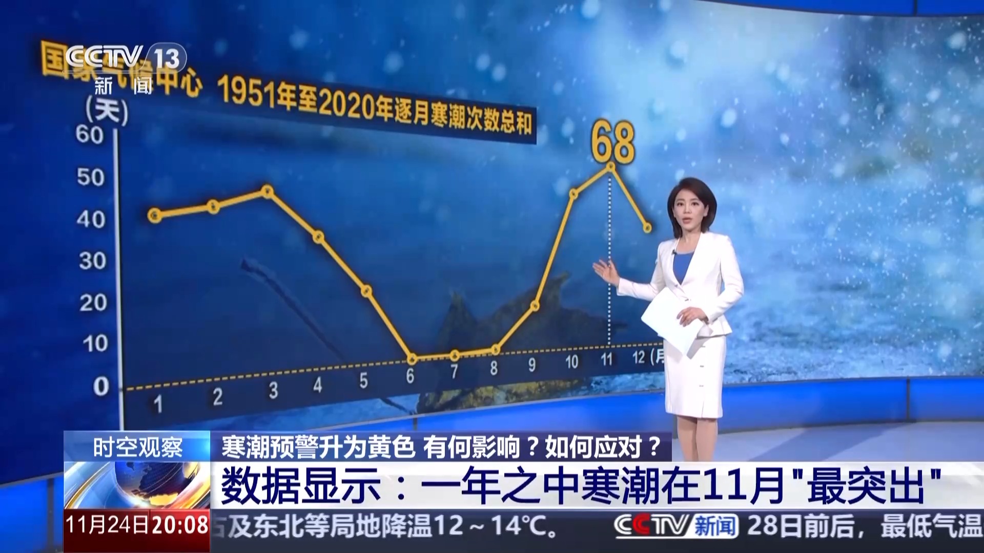 從國(guó)家氣候中心“1951年至2020年逐月寒潮次數(shù)總和”的數(shù)據(jù)中就可以看到:一年之中,寒潮在11月表現(xiàn)最突出,1951到2020年在我國(guó)一共出現(xiàn)了68次,相反在6到7月,則一次都沒(méi)有露面。