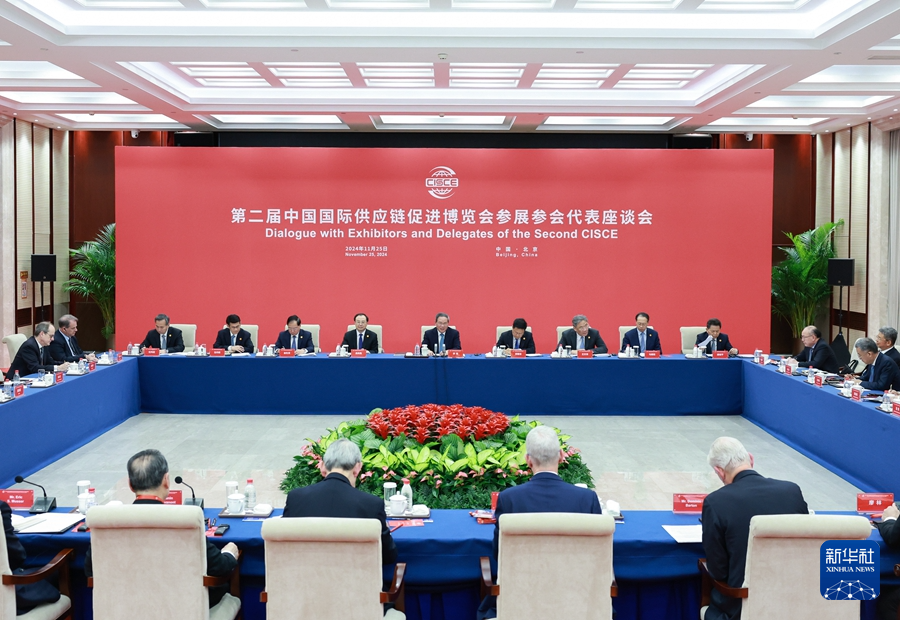 11月25日,國(guó)務(wù)院總理李強(qiáng)在北京同第二屆中國(guó)國(guó)際供應(yīng)鏈促進(jìn)博覽會(huì)參展參會(huì)企業(yè)代表座談。新華社記者 王曄 攝