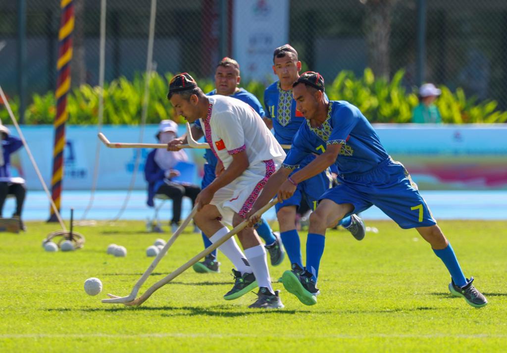 11月24日,在三亞市體育中心舉行的第十二屆全國少數民族傳統(tǒng)體育運動會室外表演項目中,新疆隊球員阿卜杜拉艾孜則·阿卜杜海娃爾(前右)在麥熱球表演中。新華社記者 陳朔 攝