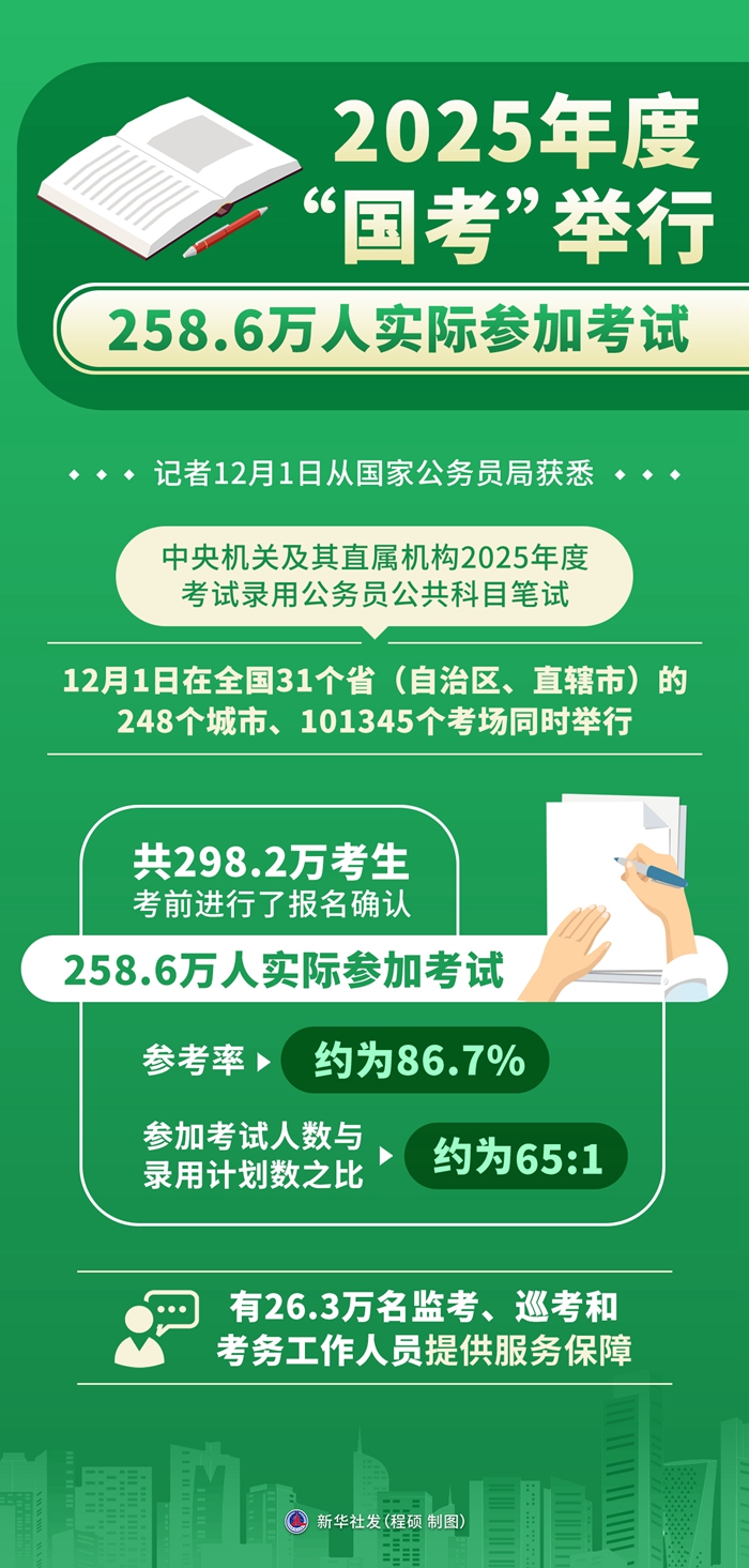 新華社北京12月1日電 記者1日從國家公務(wù)員局獲悉,中央機(jī)關(guān)及其直屬機(jī)構(gòu)2025年度考試錄用公務(wù)員公共科目筆試1日在全國31個(gè)省(自治區(qū)、直轄市)的248個(gè)城市、101345個(gè)考場(chǎng)同時(shí)舉行,共298.2萬考生考前進(jìn)行了報(bào)名確認(rèn)、258.6萬人實(shí)際參加考試,參考率約為86.7%,參加考試人數(shù)與錄用計(jì)劃數(shù)之比約為65:1,有26.3萬名監(jiān)考、巡考和考務(wù)工作人員提供服務(wù)保障。