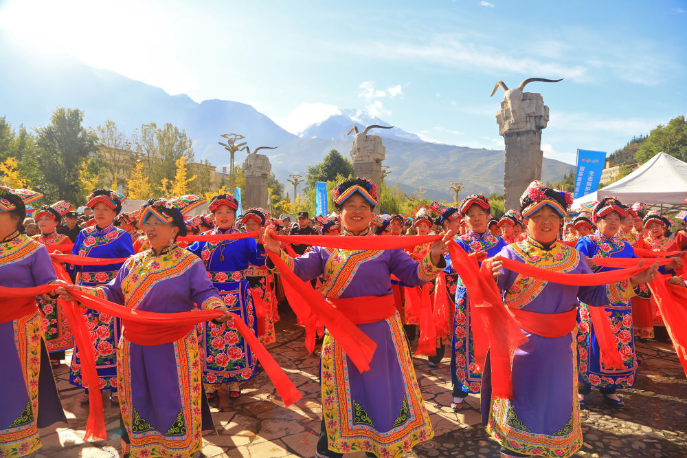 在四川省阿壩藏族羌族自治州茂縣中國古羌城,當(dāng)?shù)厍甲迦罕娸d歌載舞慶祝羌年(2024年11月1日攝)。新華社發(fā)(何清海攝)