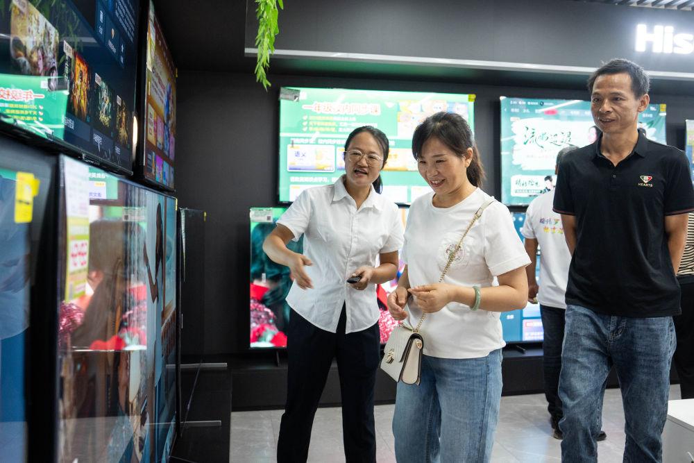 在湖南省岳陽市汨羅市屈子祠鎮(zhèn)雙楚村,彭坤、彭建華夫婦家中有一臺使用了近十年的32英寸液晶電視機(jī)。今年,在以舊換新政策的吸引下,他們決定更換一臺更大更好的電視機(jī)。根據(jù)實(shí)際需求和個人喜好,在反復(fù)對比后,他們換購了一臺75英寸的新款液晶電視機(jī)。舊電視在新機(jī)送貨上門時被當(dāng)場回收,疊加各種補(bǔ)貼后,實(shí)際成交價較廠商定價優(yōu)惠了近30%。(新華社記者 陳思汗 攝)