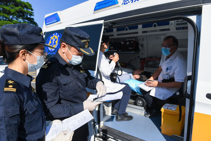 在深圳灣口岸深圳一側(cè),海關(guān)工作人員對(duì)參加第二次粵港跨境直通救護(hù)車演練的救護(hù)車進(jìn)行出境前的查驗(yàn)(2024年10月31日攝)。新華社記者 毛思倩 攝