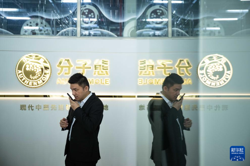 12月11日,黃滋才(右)在位于橫琴的分子態(tài)(珠海橫琴)中醫(yī)藥健康產(chǎn)業(yè)發(fā)展有限公司與同事聊天。