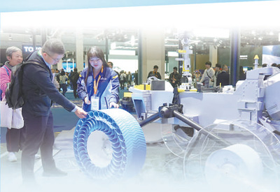第七屆中國(guó)國(guó)際進(jìn)口博覽會(huì)上,觀(guān)眾正在了解米其林月球探測(cè)車(chē)輪胎?!√?克攝