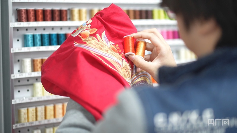 家紡企業(yè)內,設計師在眾多繡花線中選色(央廣網(wǎng)記者 王姝姝 攝)
