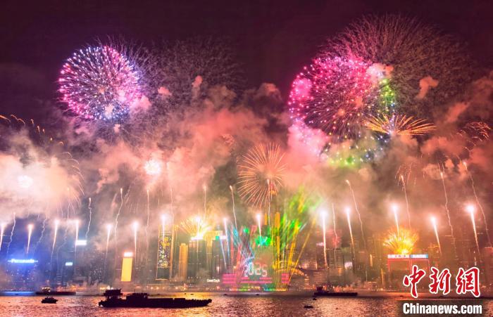 “5、4、3、2、1,新年快樂?!卑殡S著尖沙咀鐘樓敲響新年鐘聲,從5艘躉船、16艘浮船上燃放的煙花在空中綻放,點亮自北角至中環(huán)約1300米的夜空,煙花、音樂、燈光表演與維港夜景相映成趣,成為夜空中絢爛圖畫。