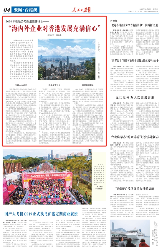“2024年,在中央政府的堅實支持和特區(qū)政府的開拓努力下,香港經(jīng)濟(jì)根基厚、市場韌性強(qiáng),正在變局中開新格局、穩(wěn)步前行?!闭雇?025年發(fā)展,特區(qū)政府財政司司長陳茂波充滿信心地表示,香港會繼續(xù)改革創(chuàng)新、搶抓機(jī)遇,加速融入國家發(fā)展大局,更主動對接國家發(fā)展戰(zhàn)略,助推香港的經(jīng)濟(jì)、社會、民生等各項事業(yè)取得更好發(fā)展,讓香港“國際大都會”的品牌煥發(fā)新光彩。
