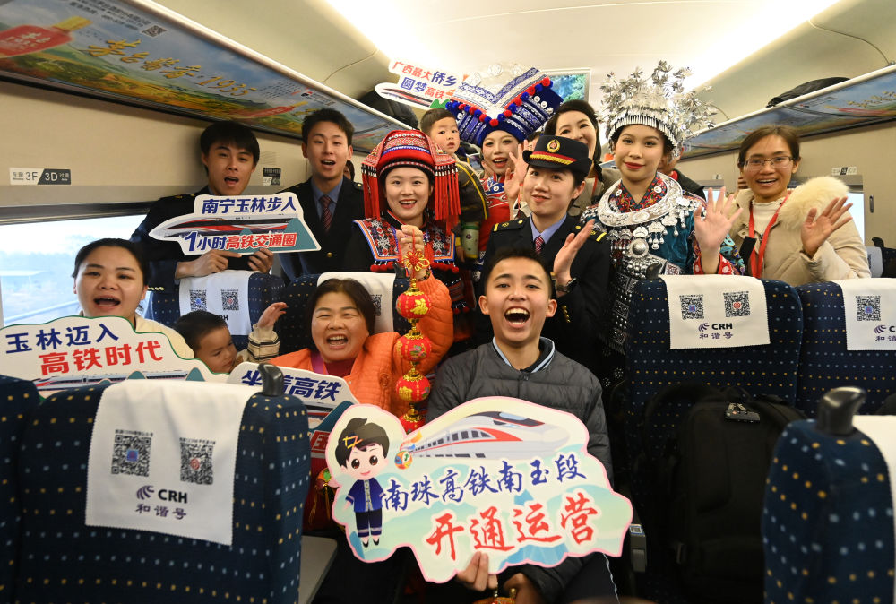 2024年12月30日,工作人員和乘客在廣西玉林開往南寧的列車上合影。