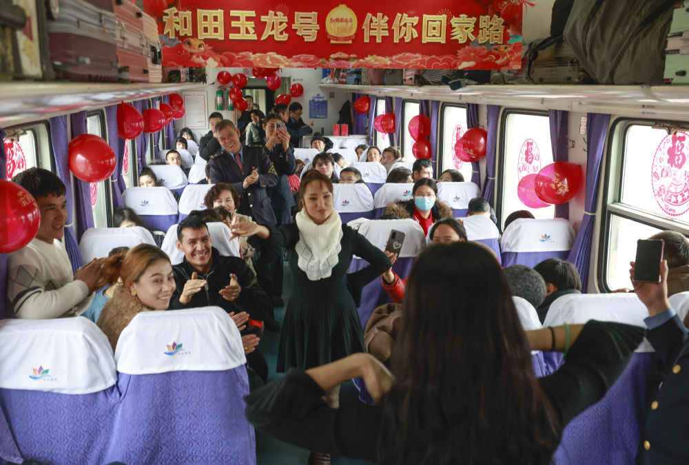 在7557次列車上,旅客隨音樂跳起麥西來(lái)甫。新華社記者 王菲 攝