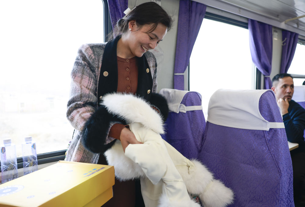 一時(shí)間,車廂內(nèi)歡聲笑語(yǔ),年味兒四溢。領(lǐng)到禮物的買合木提·阿布都瓦依提小心翼翼將春聯(lián)放進(jìn)背包,里面還裝著從烏魯木齊給女兒帶的新衣服、糖果、平板電腦。