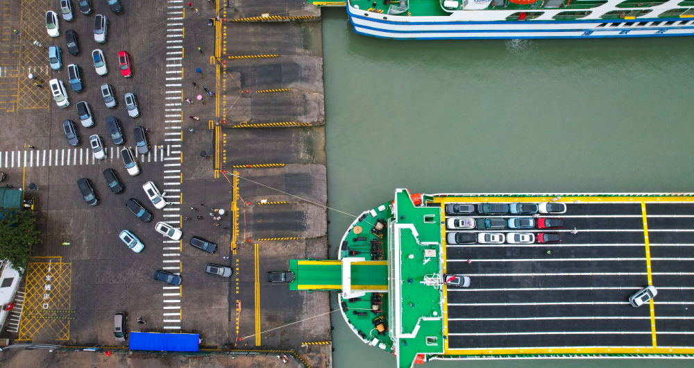 1月14日,在海南省??谑行阌⒏?,新能源車排隊駛入新能源車專用運輸船“綠源二號”(無人機照片)。(新華社記者 楊冠宇 攝)