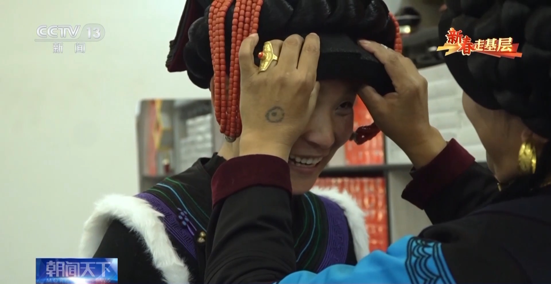這位大姐給伍加木戴上了自己親手繡的頭飾。此時,記者才意識到,她其實也只是個28歲的姑娘,正是愛美的年紀。