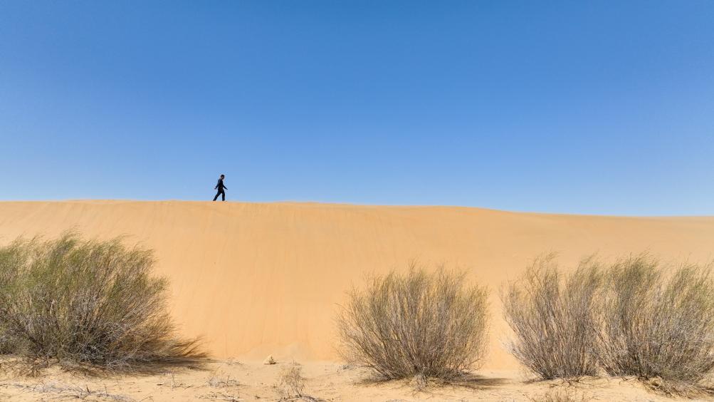 家住庫布其沙漠深處的烏日更,童年記憶里只有一種顏色?!凹依镌钆_、柜上有擦不完的黃沙,出門就是沙梁。”烏日更回憶說,家鄉(xiāng)有個民謠唱道,“沙里人苦,沙里人累,滿天風沙無植被……”