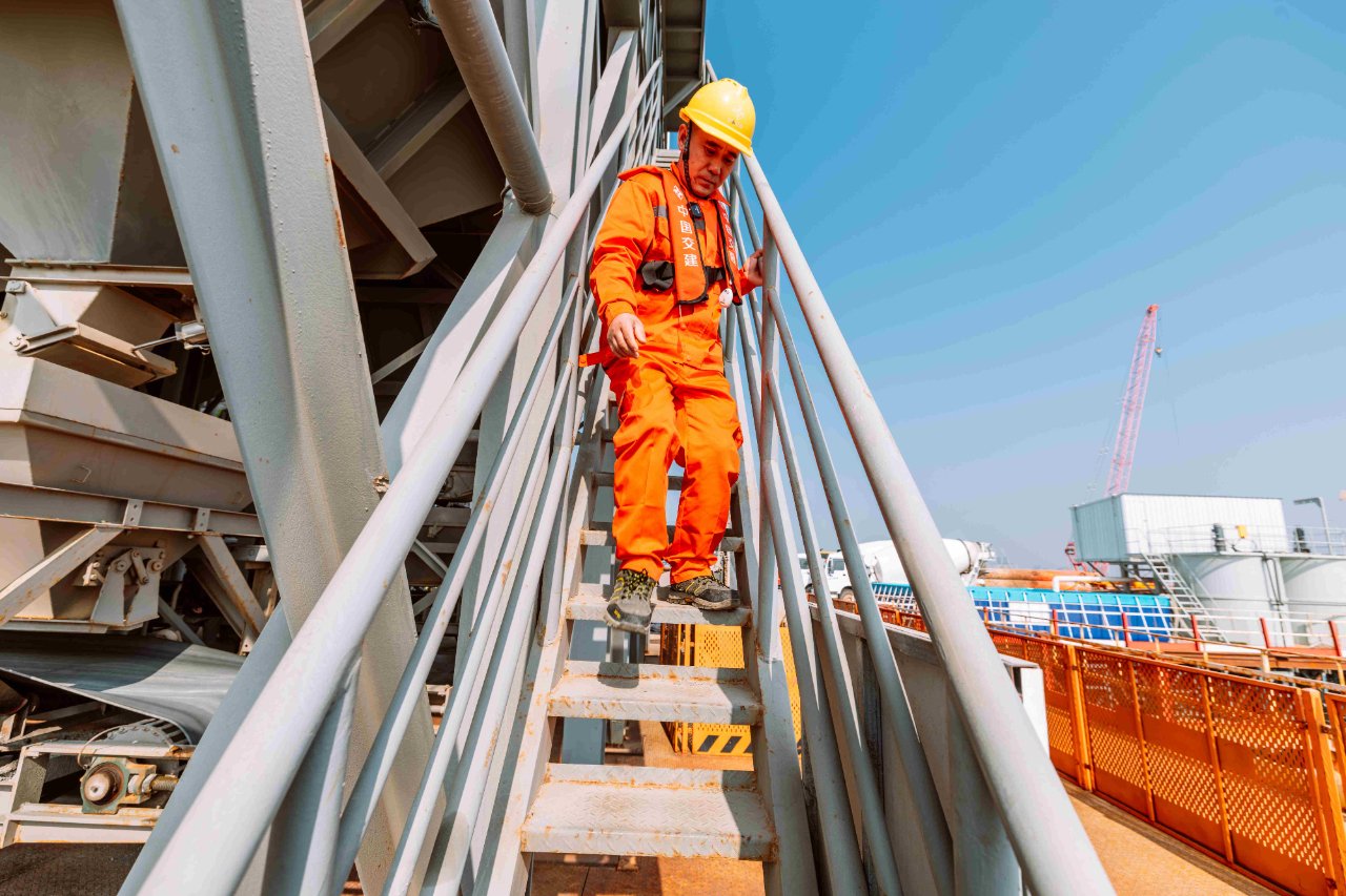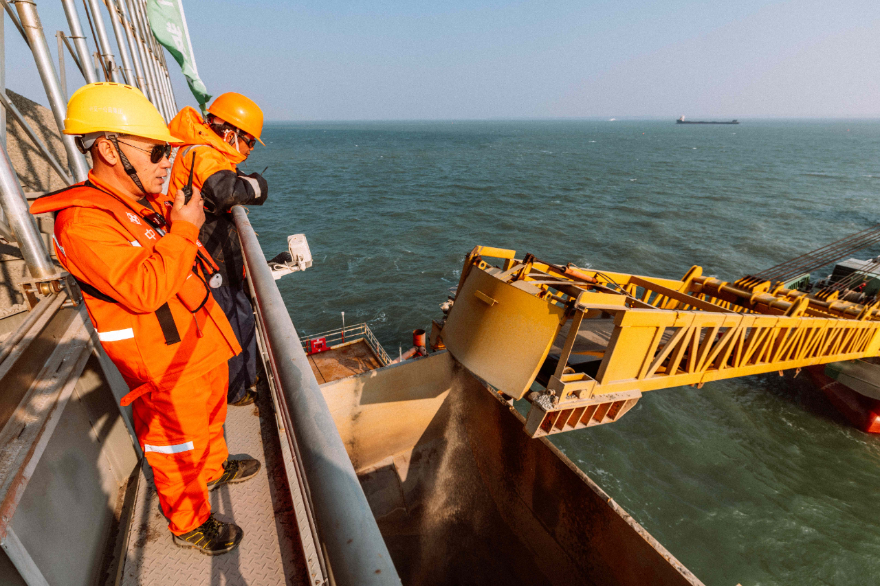 1月17日,夕陽下的廈門劉五店港區(qū),北風(fēng)勁吹。在距離中交一公局集團(tuán)廈金大橋(廈門段)項(xiàng)目海上平臺混凝土操作員梁芝敬站立位置不到30米的洋面上,一艘船身印有“帆順168”字樣的補(bǔ)料船,裝載著4000多噸砂石緩緩抵近。船頭前方延伸出一條25米長的傳送皮帶,將船上的砂料源源不斷地送抵老梁眼前的鋼制固料斗內(nèi)。當(dāng)天他們要趁著海水退潮帶來的作業(yè)窗口,為站里補(bǔ)上700噸機(jī)制砂和900噸粒徑10到20毫米的小石子,以確保混凝土站生產(chǎn)不停機(jī)。