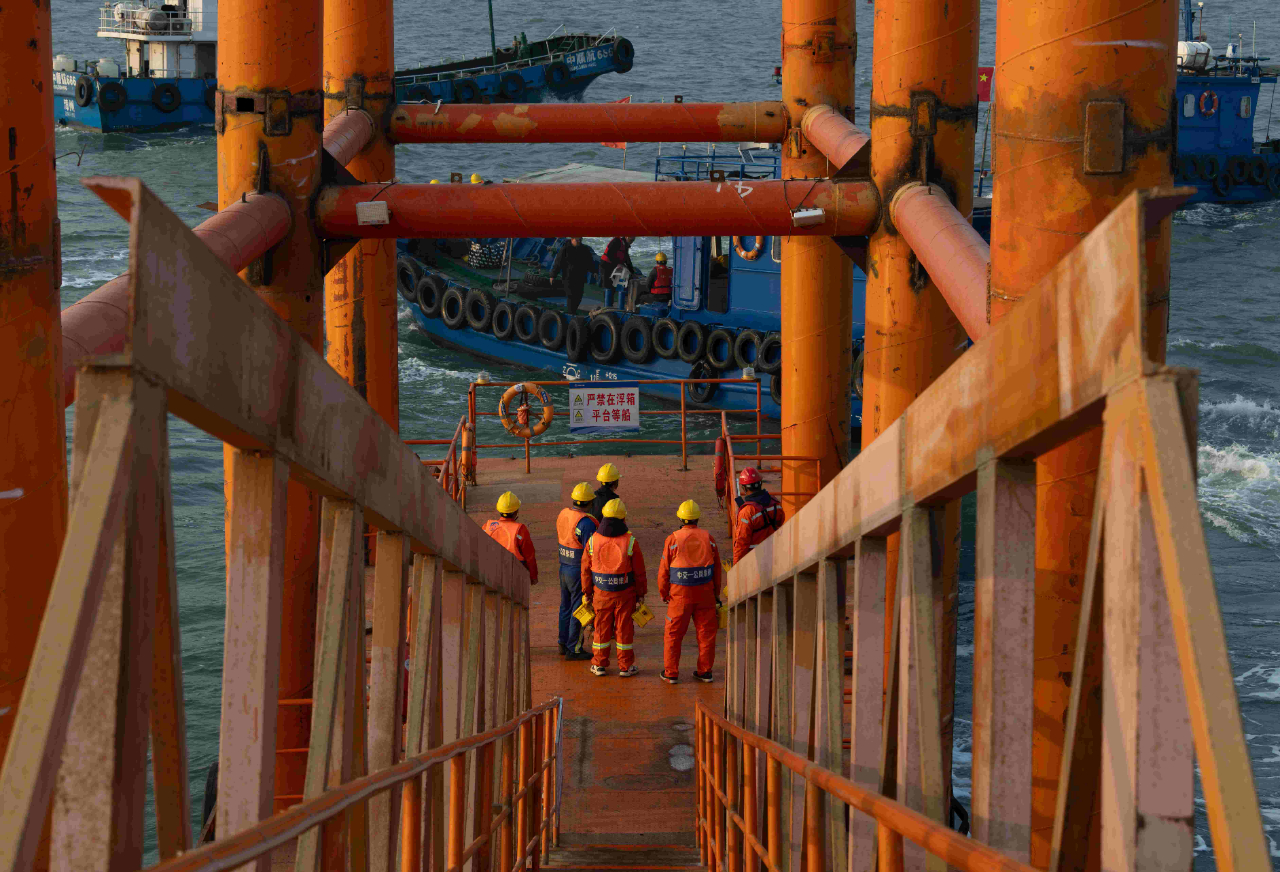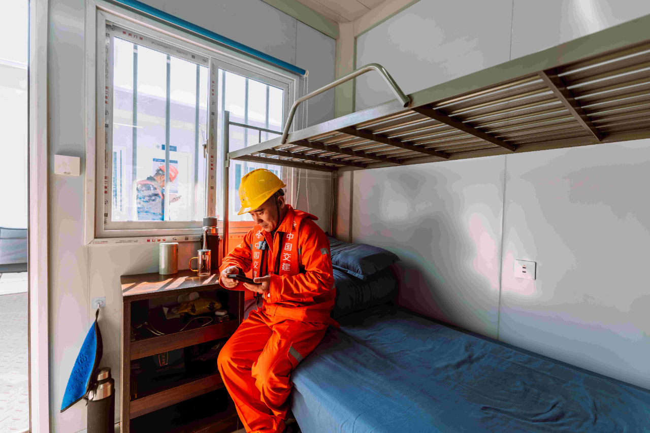梁芝敬和工友們工作的位置在離岸2海里的海上。一座總面積5萬多平方米的海上平臺,構(gòu)成了建設(shè)者們生活和工作的海上空間。工人們加班建設(shè)的劉五店航道橋,是廈金大橋(廈門段)關(guān)鍵控制性工程,全長1948米,是福建省內(nèi)最大跨徑橋梁,也是福建省首座全離岸式海中懸索橋。春節(jié)前,項(xiàng)目部要完成沉井系梁6000方以及主塔套箱6640方封底混凝土澆筑任務(wù)。為此,梁芝敬和工友們需要不間斷倒班作業(yè),以保障工程任務(wù)能夠如期完成。而記者采訪時,距離梁芝敬上一次離開海上平臺,已經(jīng)過去57天。