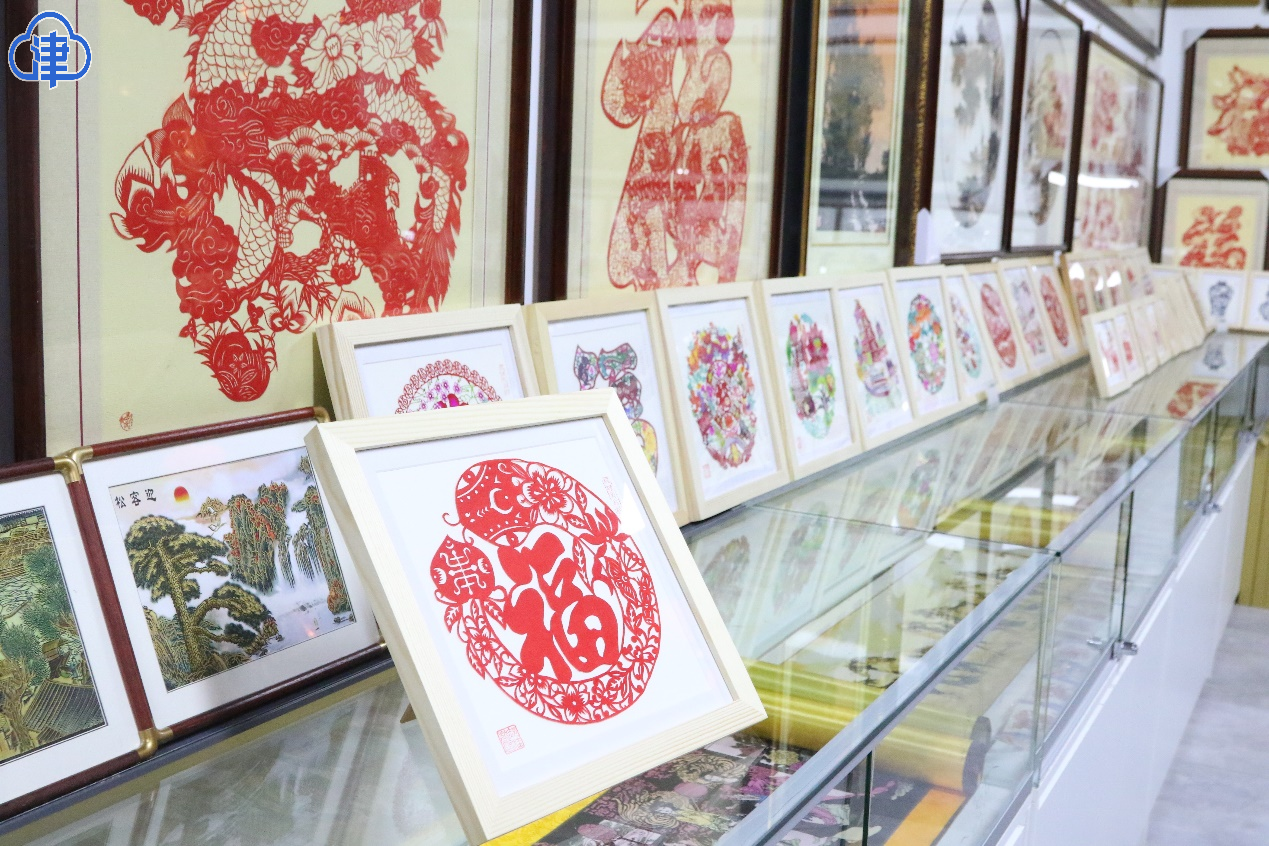 在戲樓對(duì)面,楊柳青剪紙世家第四代傳人,郝桂芬的剪紙鋪吸引了眾多游客的駐足。郝桂芬既是店鋪的“當(dāng)家人”,也是非遺剪紙項(xiàng)目的代表性傳承人。楊柳青剪紙的技法,既需要用北方剪刀剪出輪廓,又需要用南方刻刀雕飾細(xì)節(jié)。郝桂芬的獨(dú)門絕技——染色剪紙,是先用白紙剪出樣式,再用楊柳青年畫的技法上色。她的剪紙作品包括花鳥魚蟲、神話故事、喜慶吉祥圖案等,深受游客喜愛。在這里,游客們不僅可以購買到精美的剪紙作品,還能在學(xué)習(xí)體驗(yàn)剪紙技法,感受指尖上的古老藝術(shù)。