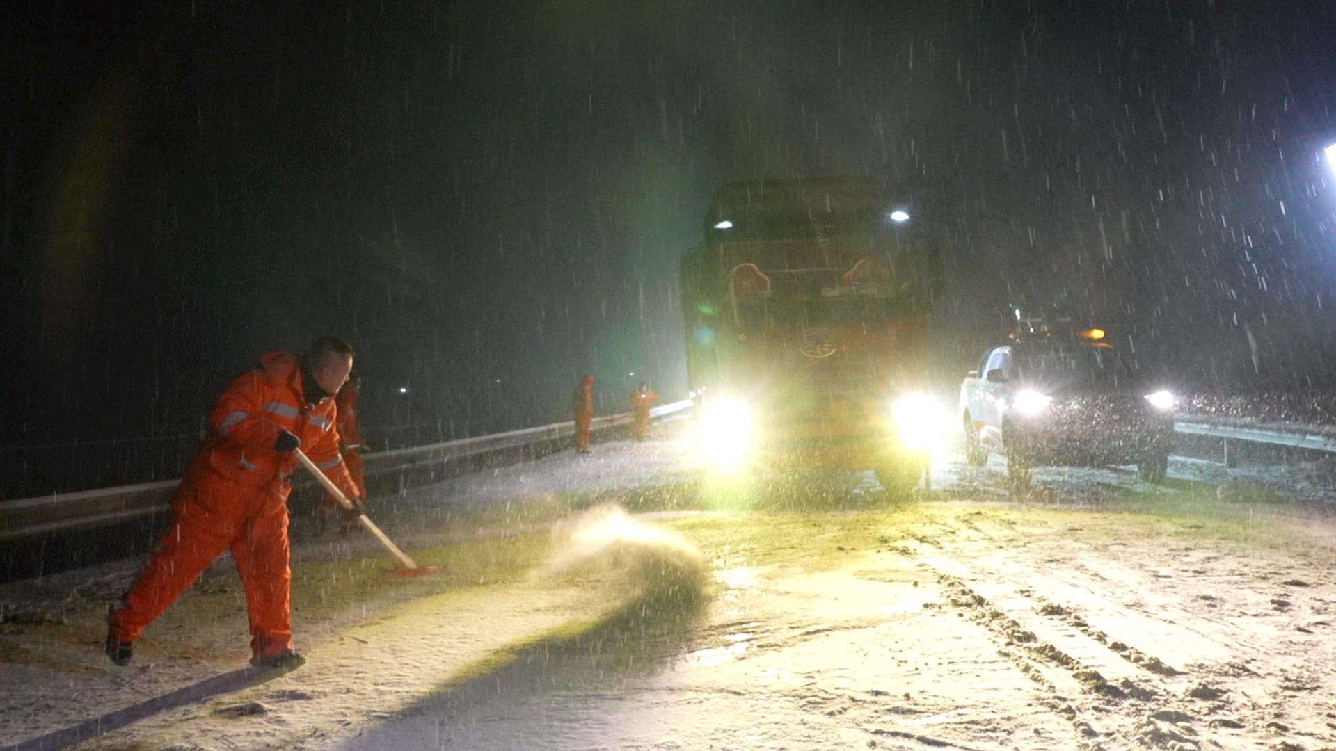大貨車打滑熄火,記者步行都極易摔倒。23名公路人緊急出動,大型除雪車、破冰車、融雪劑撒布車不間斷作業(yè)。